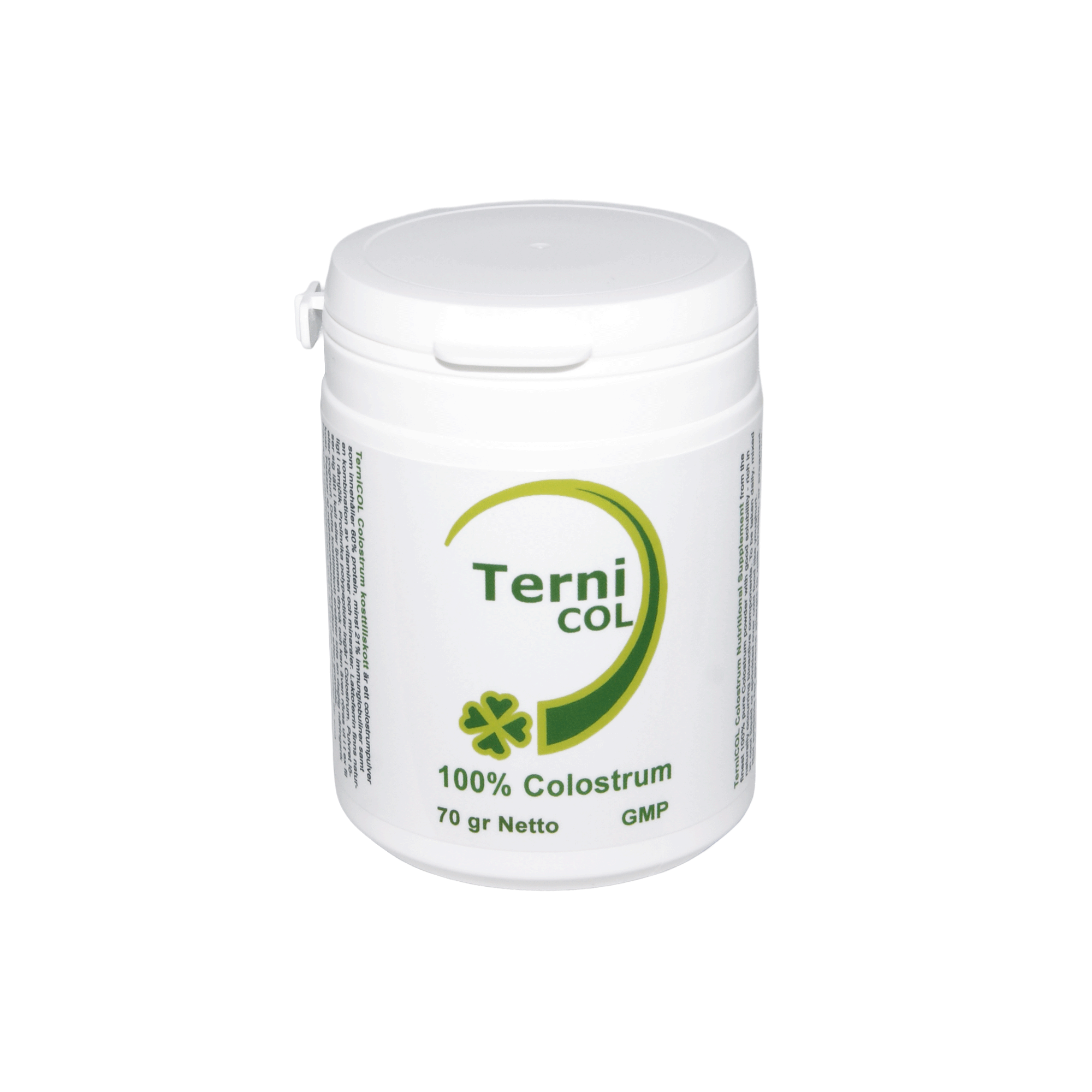 TerniCOL Colostrum kosttillskott är ett colostrumpulver som innehåller 60% protein, minst 21% immunglobuliner samt en kombination av vitaminer och mineraler. Laktoferrin finns naturligt i colostrum (råmjölk). Prolinrika polypeptider (PRP) ingår i colostrum. Pulvret löser sig lätt i kall eller ljummen dryck och kan även röras ut i fil eller yoghurt. Detta kosttillskott ersätter inte en daglig näringsrik kost. Passar ej mjölkproteinallergiker eller gravida.